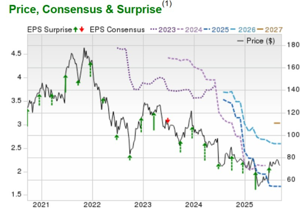 Overall, Nike’s total sales are currently slated to dip 1% in its current fiscal 2026 but are projected to rebound and rise 6% in FY27 to $48.41 billion. Nike’s annual earnings are forecasted to drop over 20% in FY26 to $1.68 per share, although FY27 EPS is projected to rebound and spike 58% to $2.59.